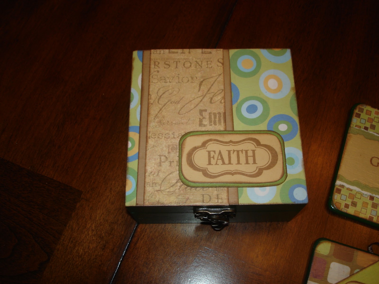 Step 1: You need to decide on the layouts for the tops of the coasters. I cut and stamped a base piece of paper to cover the original Joy Christmas paper that was on the coaster. I used green paper to coordinate with the green backs of the coaster. I loved the look of the outside of the original box and do not want to have to repaint the box and coasters.