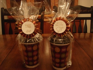 Load your cups up with a handful of chocolates and coffee or tea fixin’s. Put the Milano cookies behind the cup, wrap with cellophane wrapping, tie it closed with coordinating ribbon and attach your tag. How fast and easy it that?!